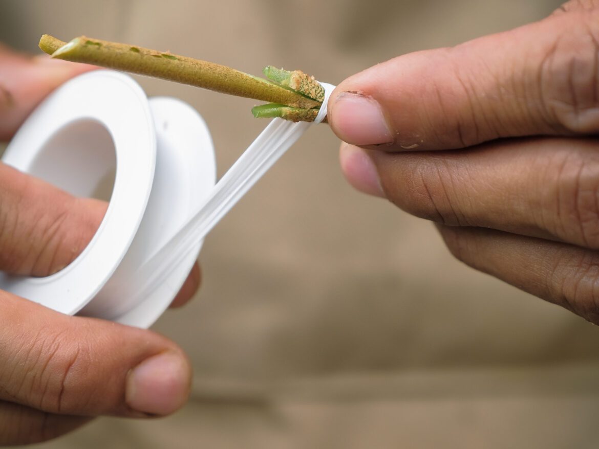 The next step is to wrap your grafts with nursery tape around their junctions tightly but gently so that they don’t move apart but also don’t get damaged by excessive pressure. Nursery tape is a special kind of tape that decomposes naturally when exposed to moisture and sunlight.